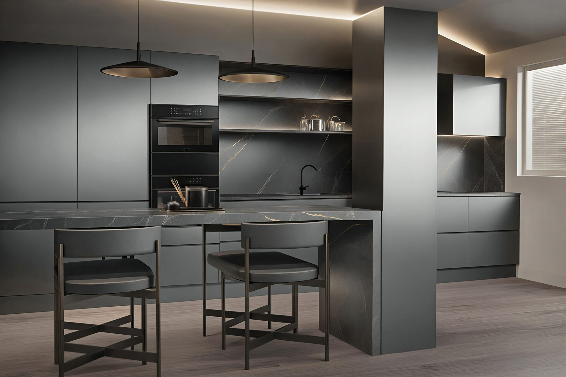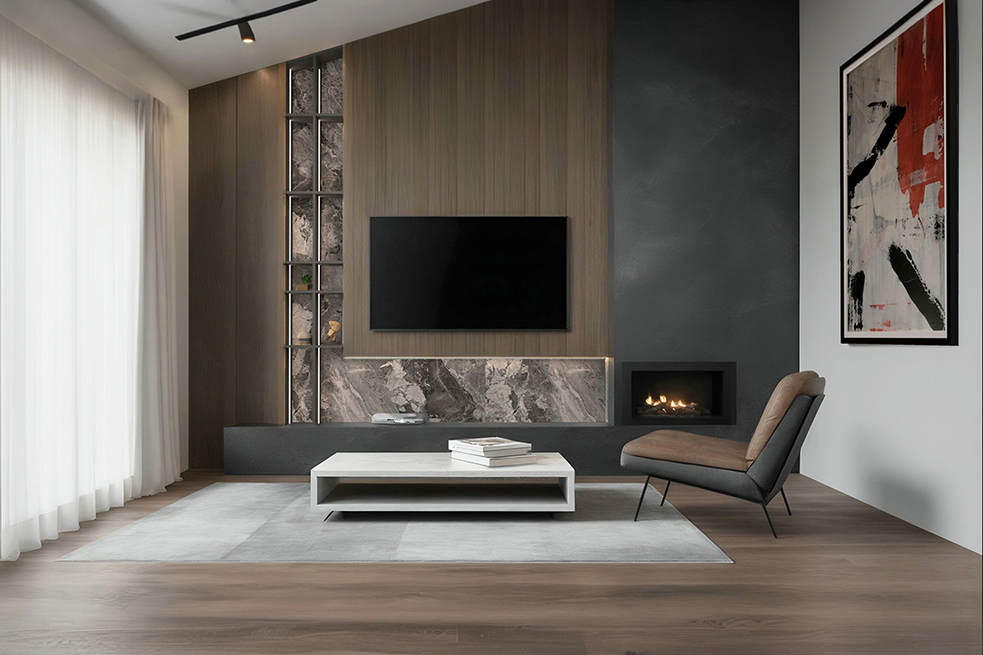 The central area of the home defines the modern character of the entire interior: dark matte surfaces, stone patterns with pronounced texture, and linear lighting create a striking contrast that radiates clarity of form and contemporary style. The living room enriches the atmosphere with warmer materials and soft lighting accents, while carefully designed details — from wooden wall claddings to integrated niches and minimalist furniture — emphasize the sense of spaciousness and elegance.