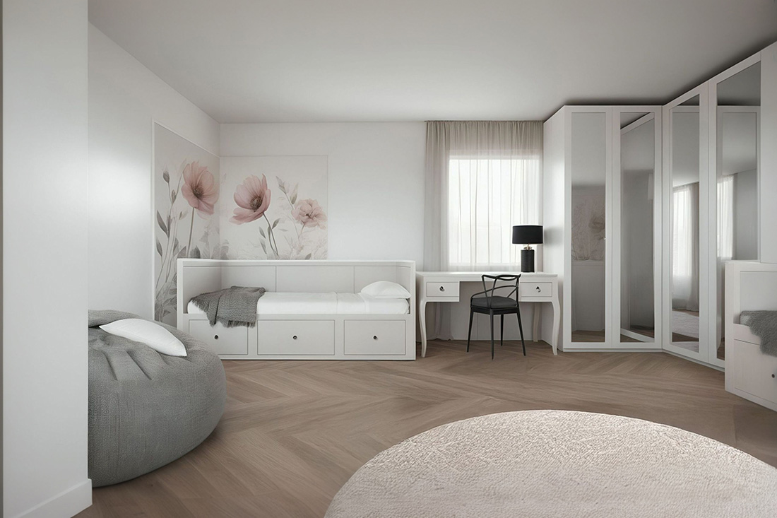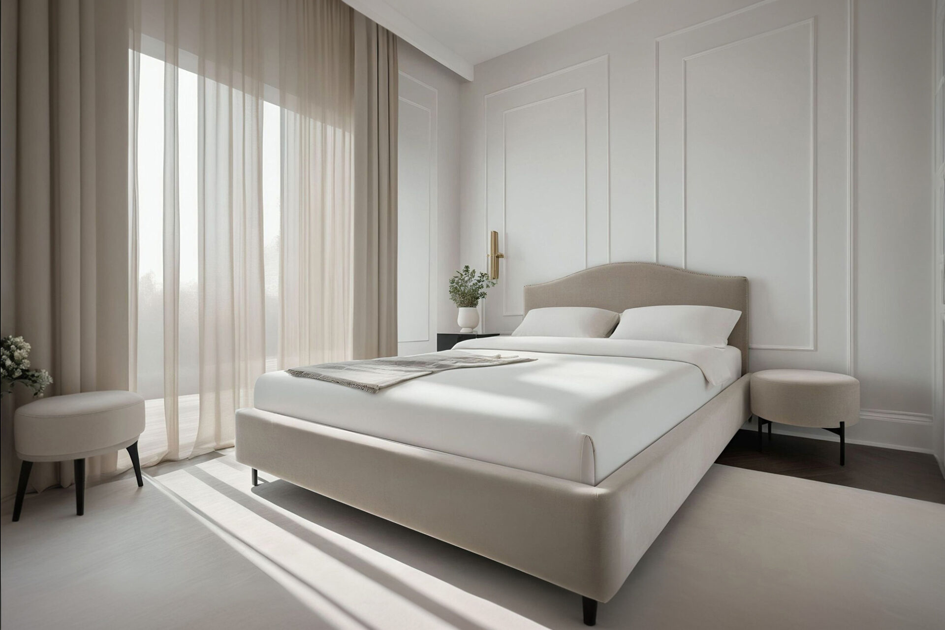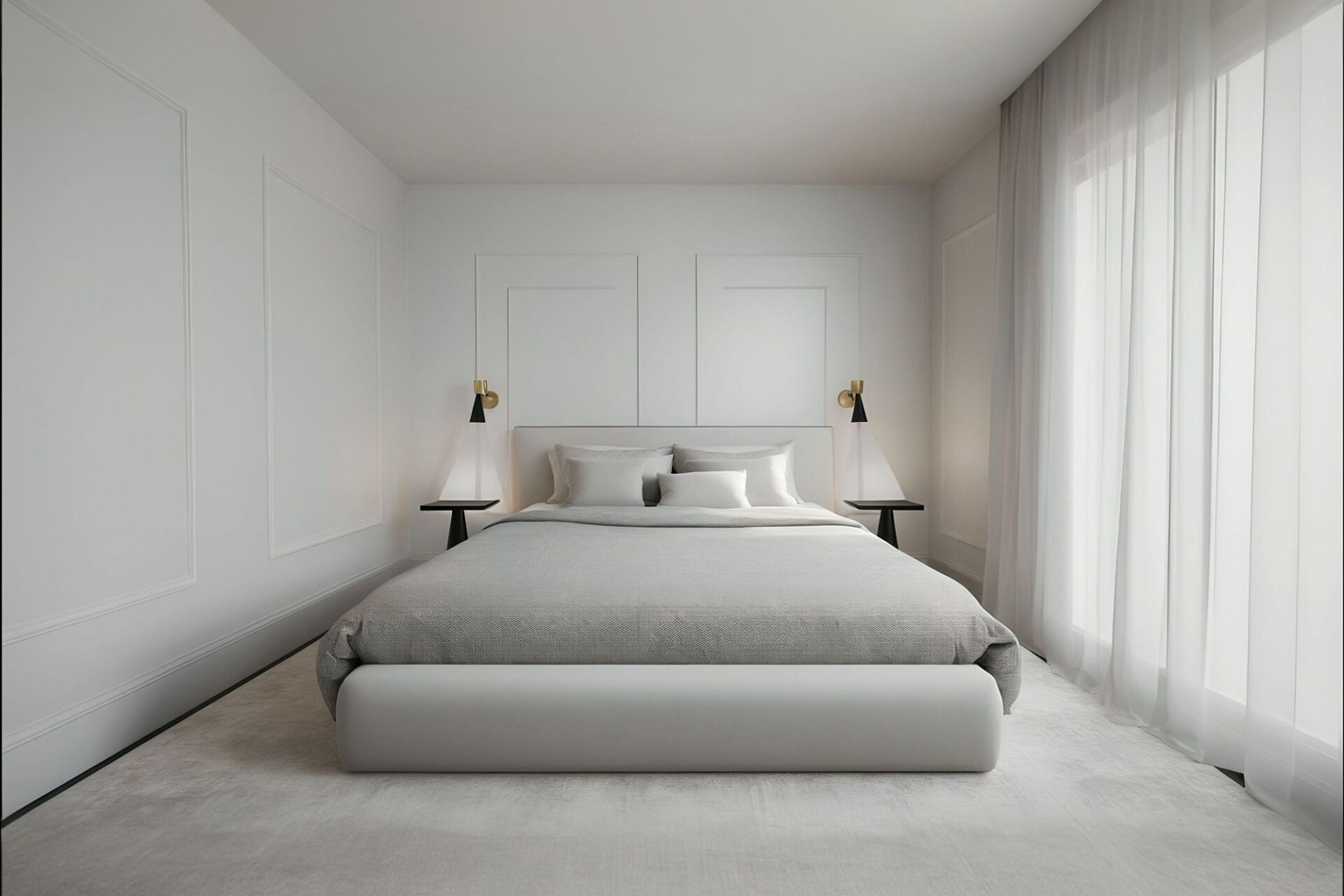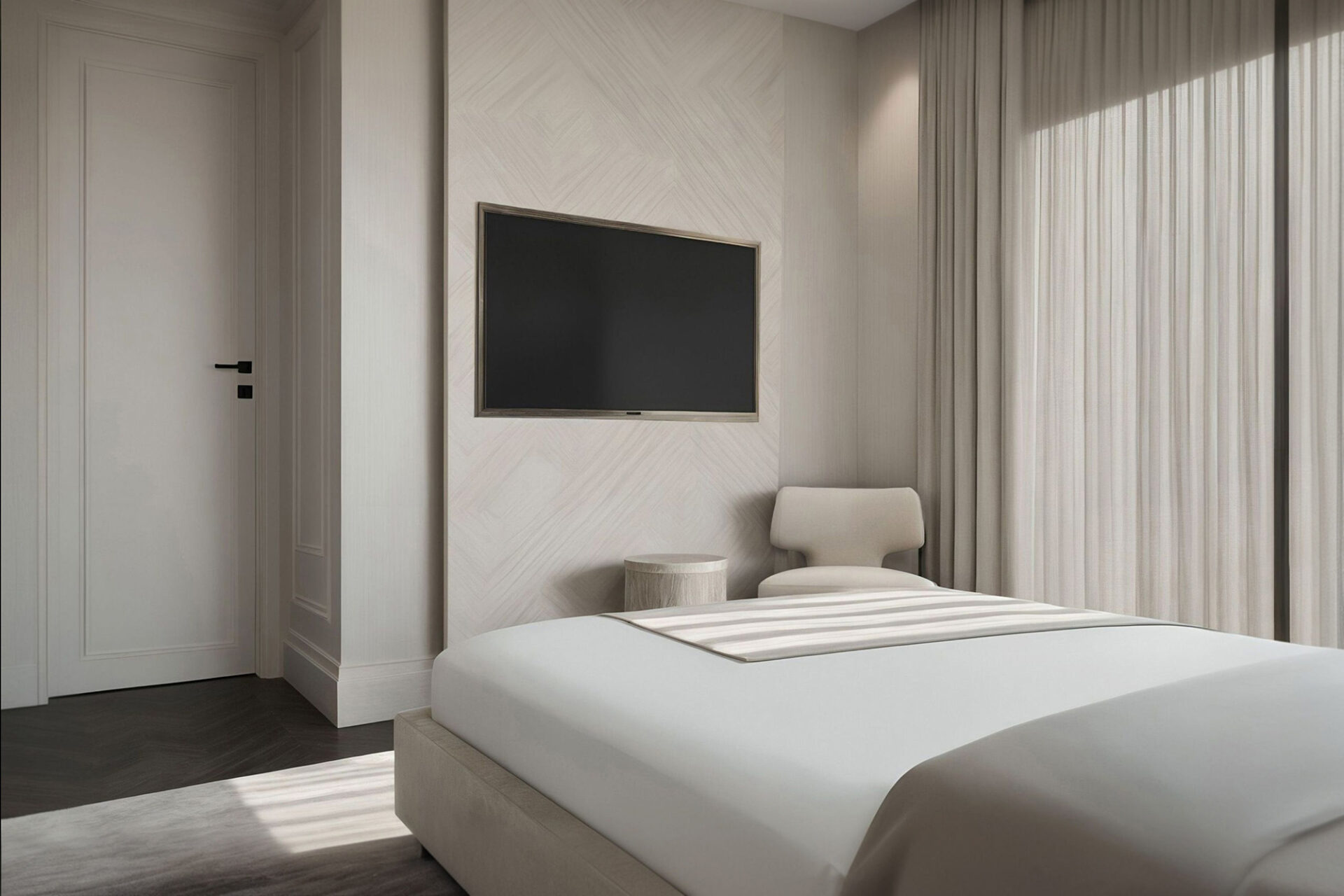Spavaće sobe zadržavaju meku eleganciju kroz uravnoteženu paletu, tapete profinjenih uzoraka i suzdržane zidne okvire koji stvaraju osjećaj mirnoće i odmora.