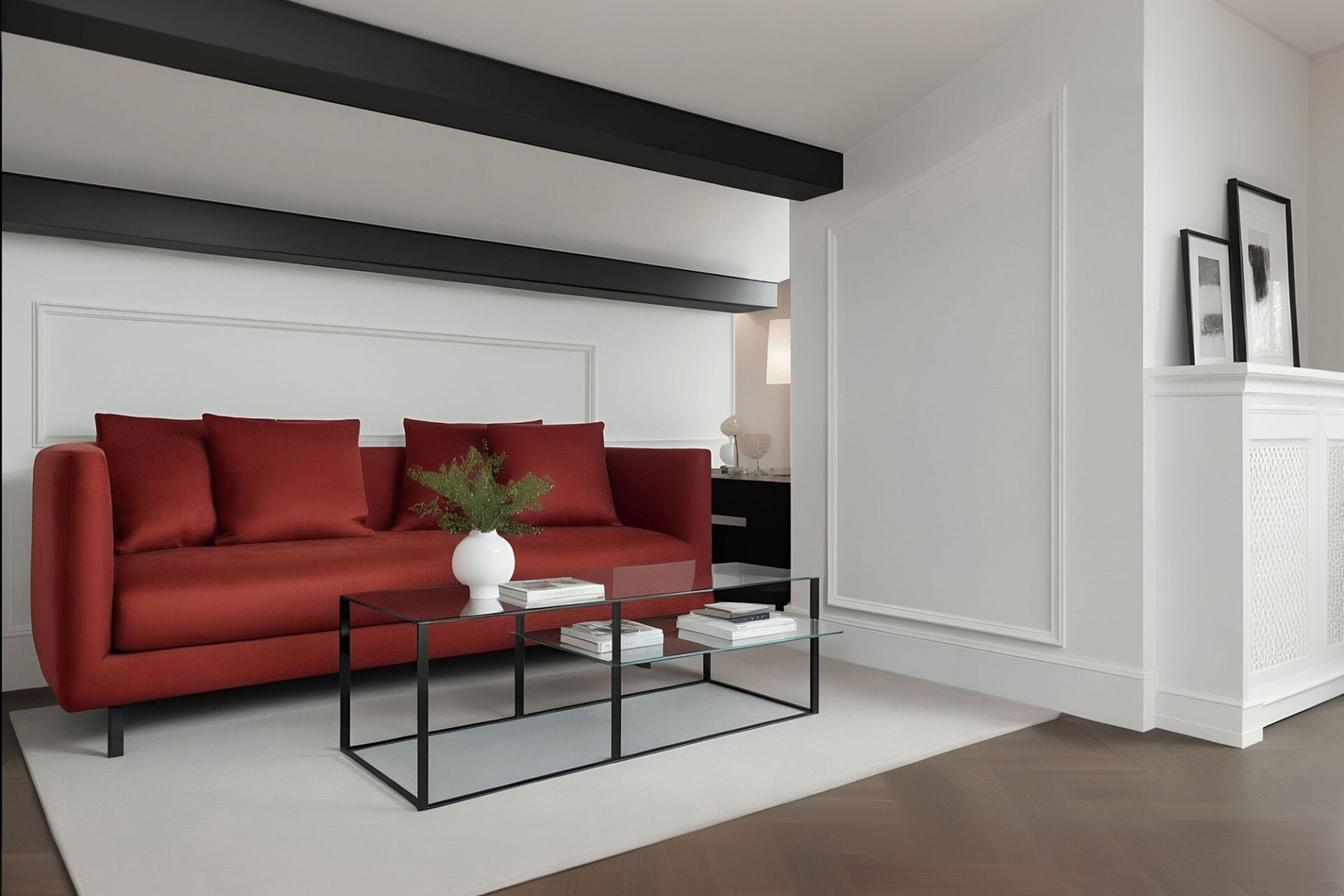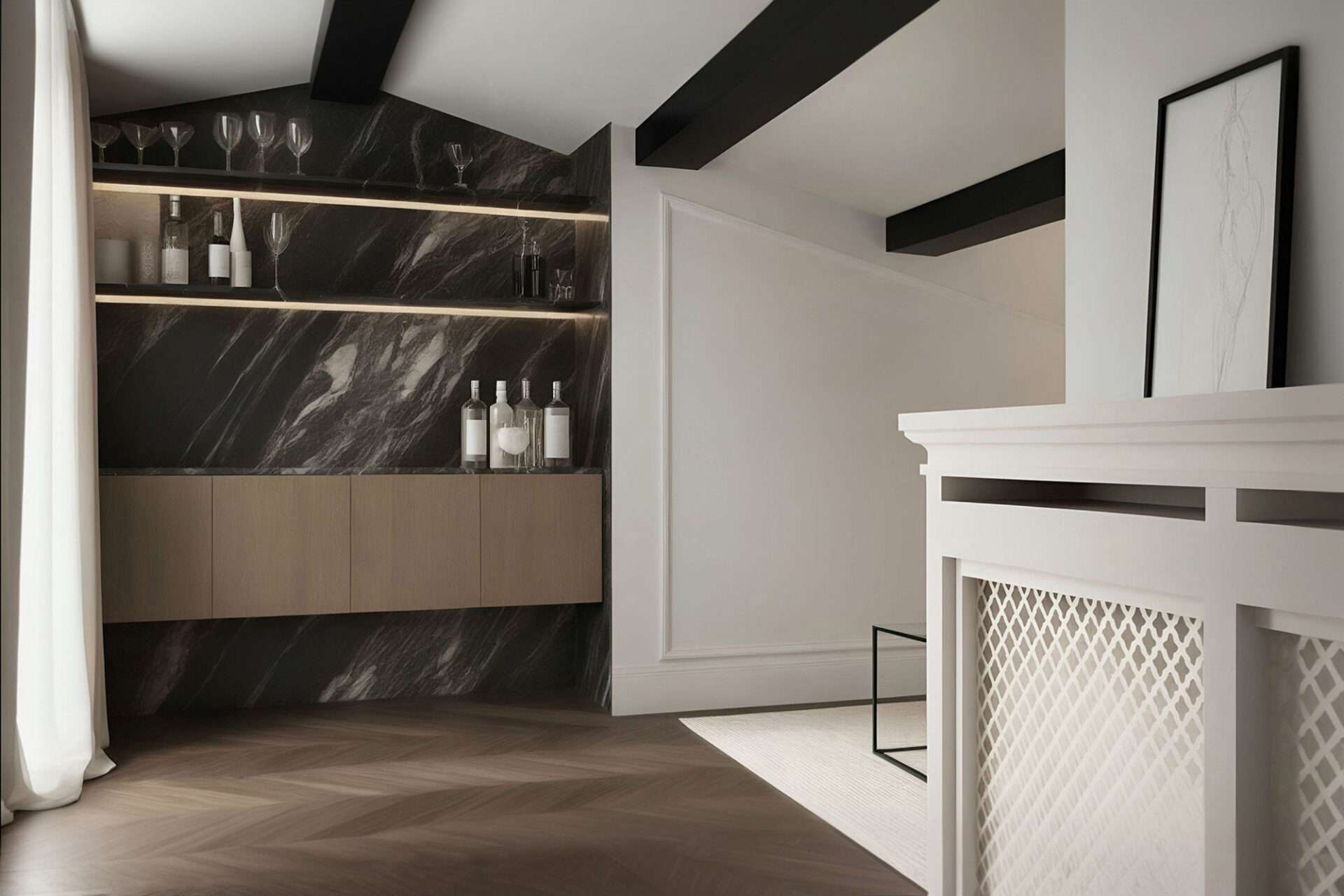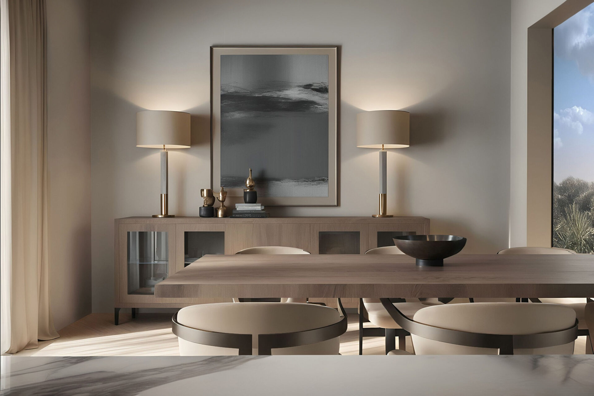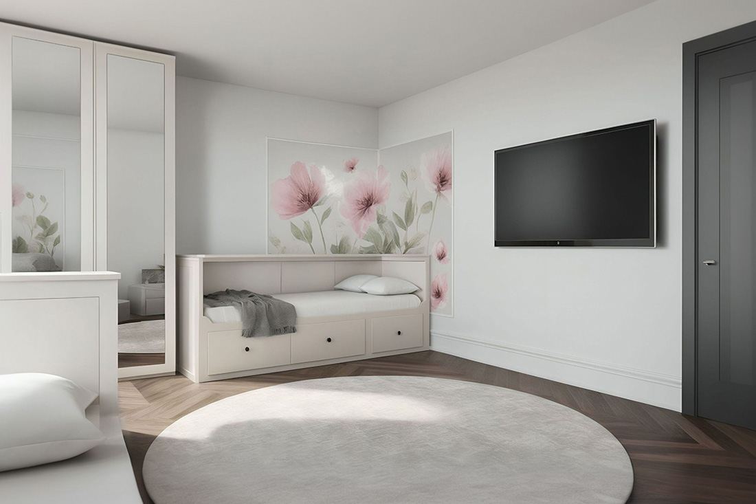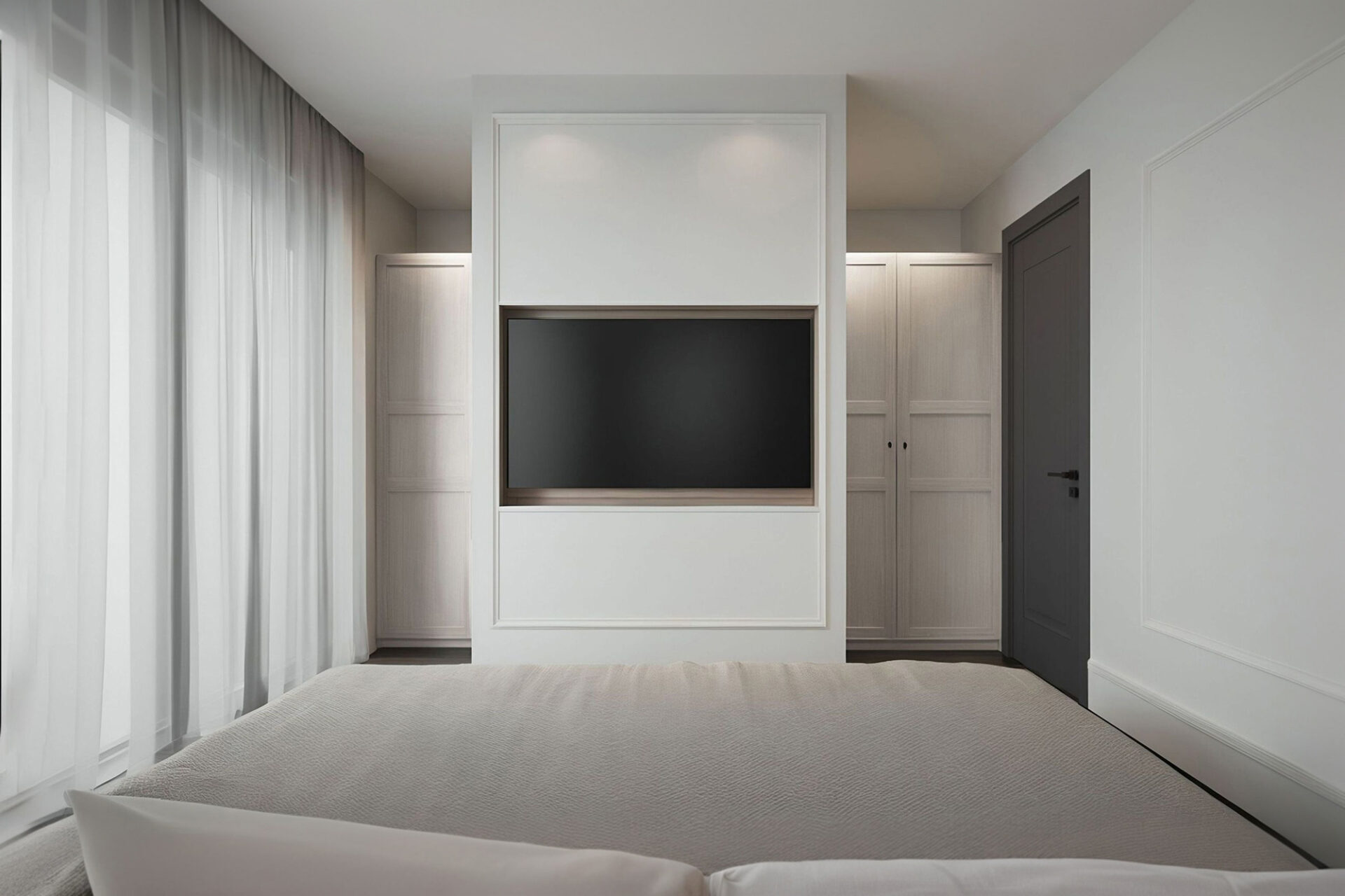 Spavaće sobe zadržavaju meku eleganciju kroz uravnoteženu paletu, tapete profinjenih uzoraka i suzdržane zidne okvire koji stvaraju osjećaj mirnoće i odmora.