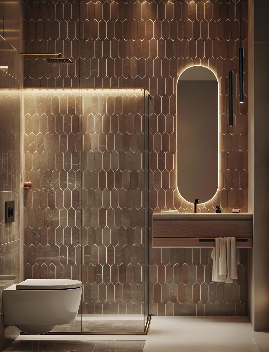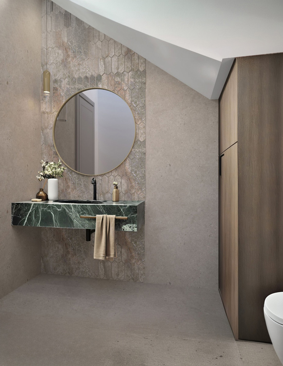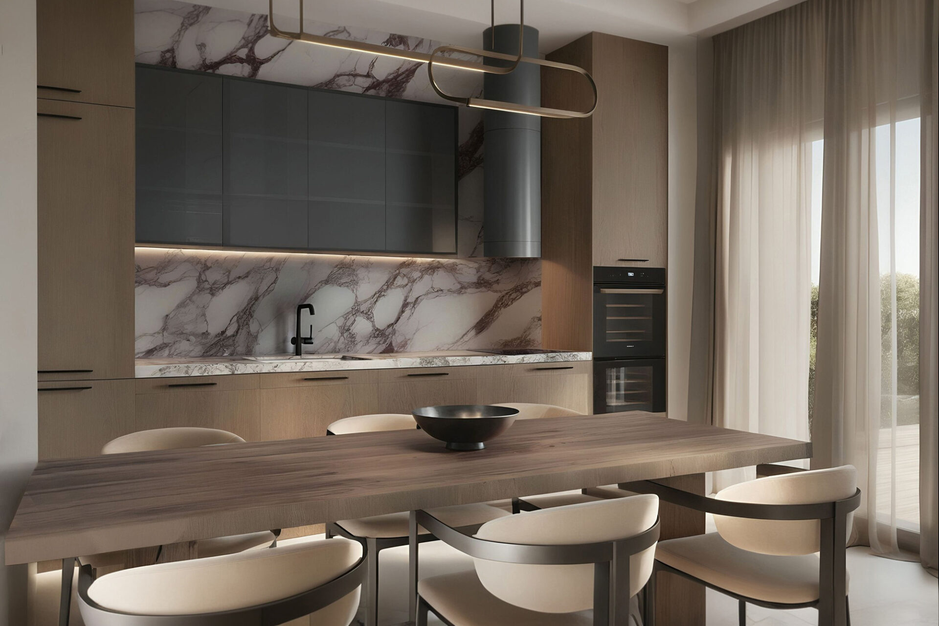 Potpuna renovacija vikendice u Puntu rezultirala je interijerom koji spaja suvremenu lakoću s profinjenim klasičnim detaljima. Donje etaže oblikovane su kao topla, prozračna zona okupljanja obitelji i prijatelja, s prirodnim tonovima drva, smirenim teksturama i pažljivo postavljenim akcentima. Poseban pečat prostoru daju dojmljive keramičke obloge – od dinamičnih dekora s izraženim venama do suptilnih heksagonalnih formata – koje unose ritam, dubinu i prepoznatljiv karakter u prostore kuhinje, kupaonica i komunikacija.