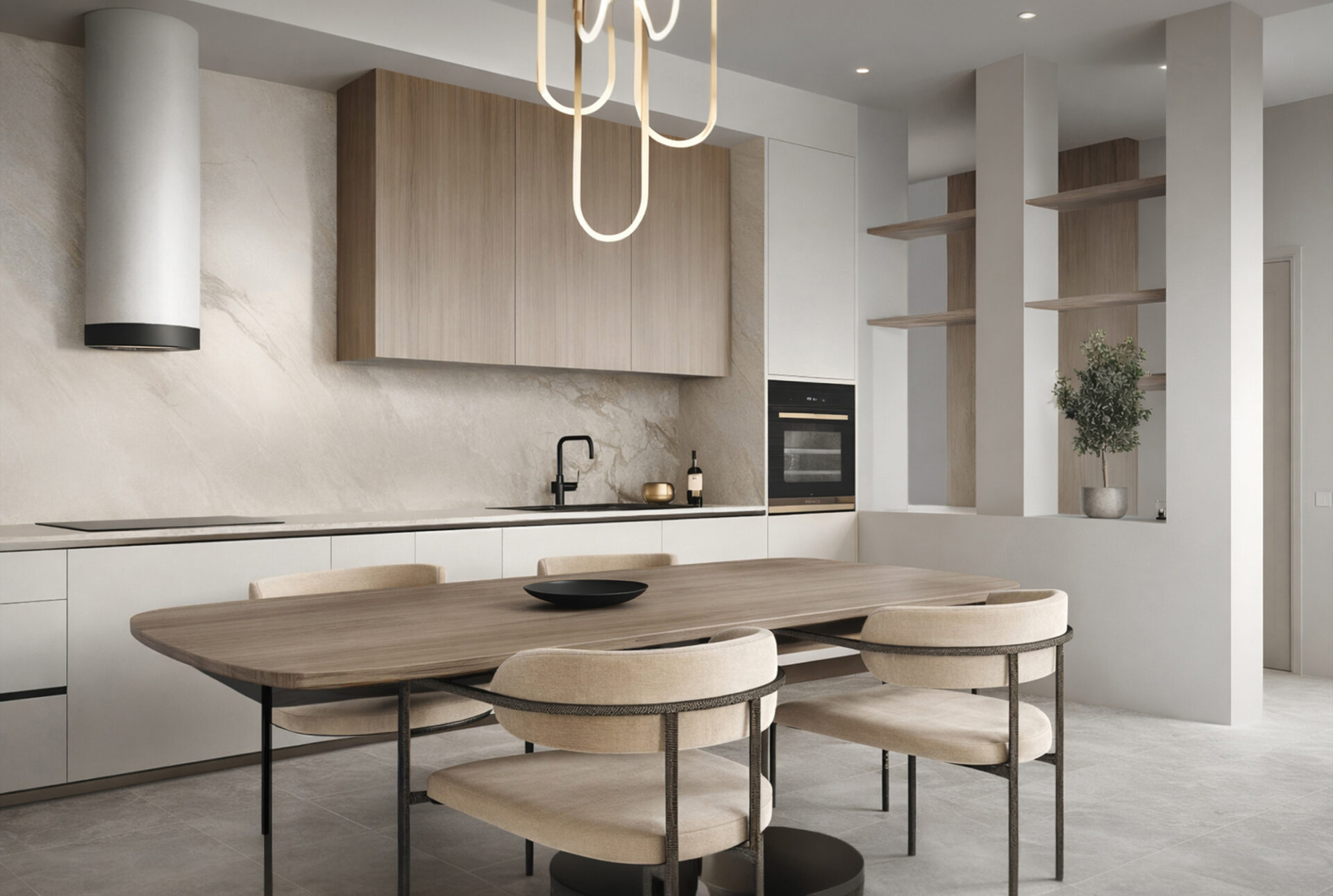 Otvoreni dnevni prostor zamišljen je kao jedinstvena cjelina u kojoj se kuhinja, blagovaonica i dnevni boravak prirodno nadovezuju jedan na drugi, bez vizualnih prekida. Neutralna paleta toplih bež, sivih i drvenih tonova stvara podlogu koja prostor čini svijetlim i ugodnim, dok pažljivo odabrani detalji unose suptilnu dinamiku i karakter. Posebna pažnja posvećena je ravnoteži između čistoće linija i mekoće oblika, vidljivoj u izboru namještaja, rasvjete i tekstila.