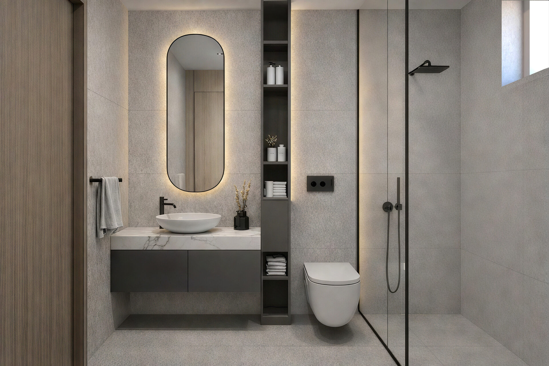 Kupaonica slijedi filozofiju suzdržane elegancije, uz blago naglašen suvremeni izraz. Kombinacija kamenih površina, čistih linija i integriranih niša rezultira prostorom koji djeluje mirno, uredno i profinjeno.