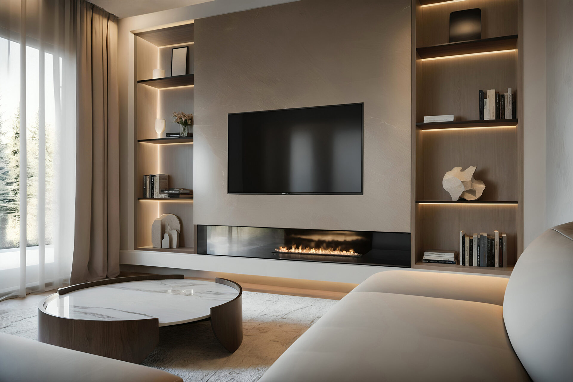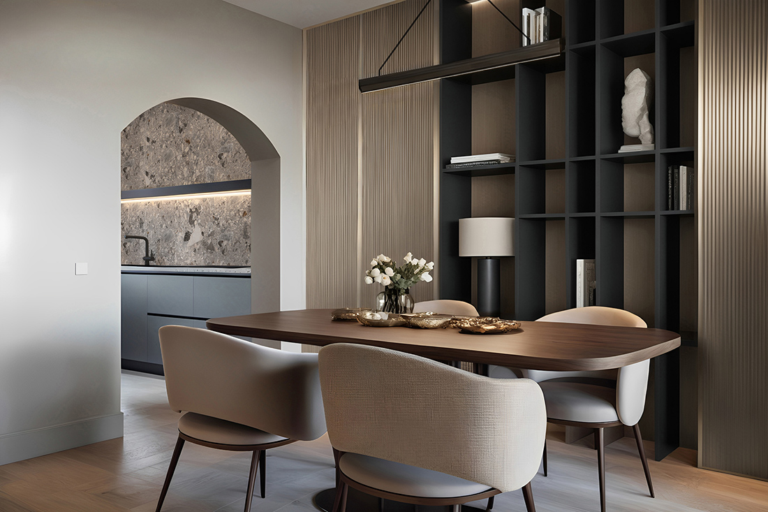 Dnevna zona osmišljena je kao reprezentativno, ali intimno središte stana. Integrirani elementi poput ugradbenih polica, skrivenog LED osvjetljenja i kamina doprinose osjećaju topline i ugodne atmosfere, dok zaobljene forme namještaja, decentni metalni akcenti i odmjereni dekor dodatno naglašavaju ravnotežu između klasičnih i suvremenih linija. Rasvjeta pritom ima važnu ulogu u stvaranju različitih ambijenata tijekom dana i večeri.