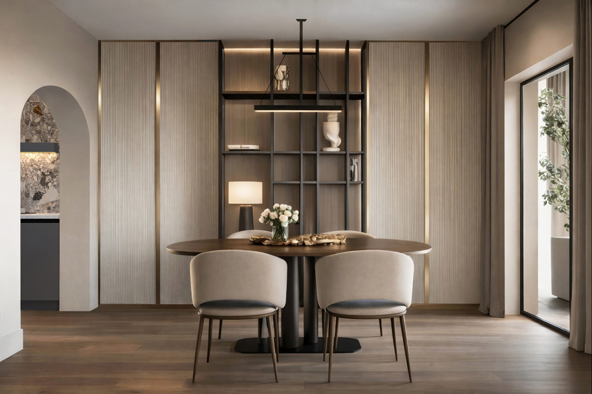 U ovom projektu interijera stana u Rovinju fokus je bio na stvaranju profinjenog, suvremenog prostora s jasnim referencama na klasičnu eleganciju. Koncept je razvijen za mlađi par koji cijeni bezvremenski dizajn, ali istovremeno očekuje funkcionalnost i vizualnu čistoću prilagođenu svakodnevnom životu. Osnovu dizajna čini smirena, topla paleta neutralnih tonova – bež, siva i prirodne nijanse drva – koje prostoru daju osjećaj ugode, kontinuiteta i sofisticiranosti. Materijali su birani s naglaskom na teksturu i taktilnost: strukturirane zidne obloge, drvene plohe s vertikalnim rasterom, kamene i terrazzo površine te mekane tekstilne završne obrade. Posebnu ulogu ima rebrasto staklo koje uvodi ritam i profinjenu igru svjetla, diskretno povezujući klasične elemente s modernim dizajnerskim izrazom.