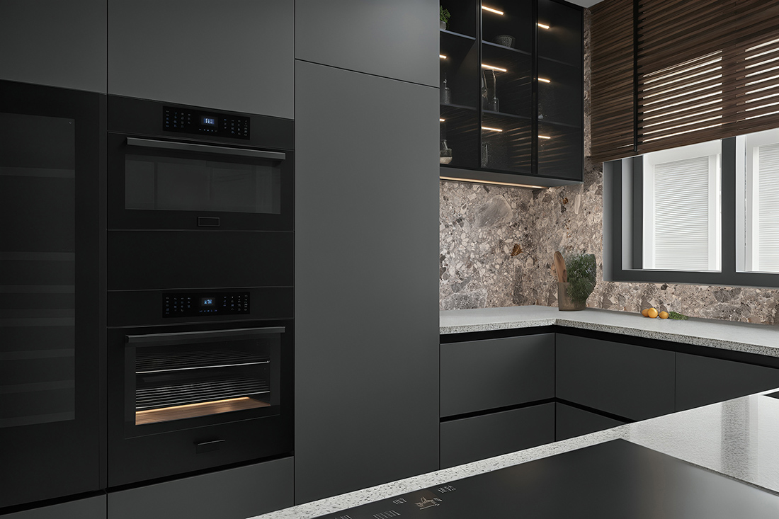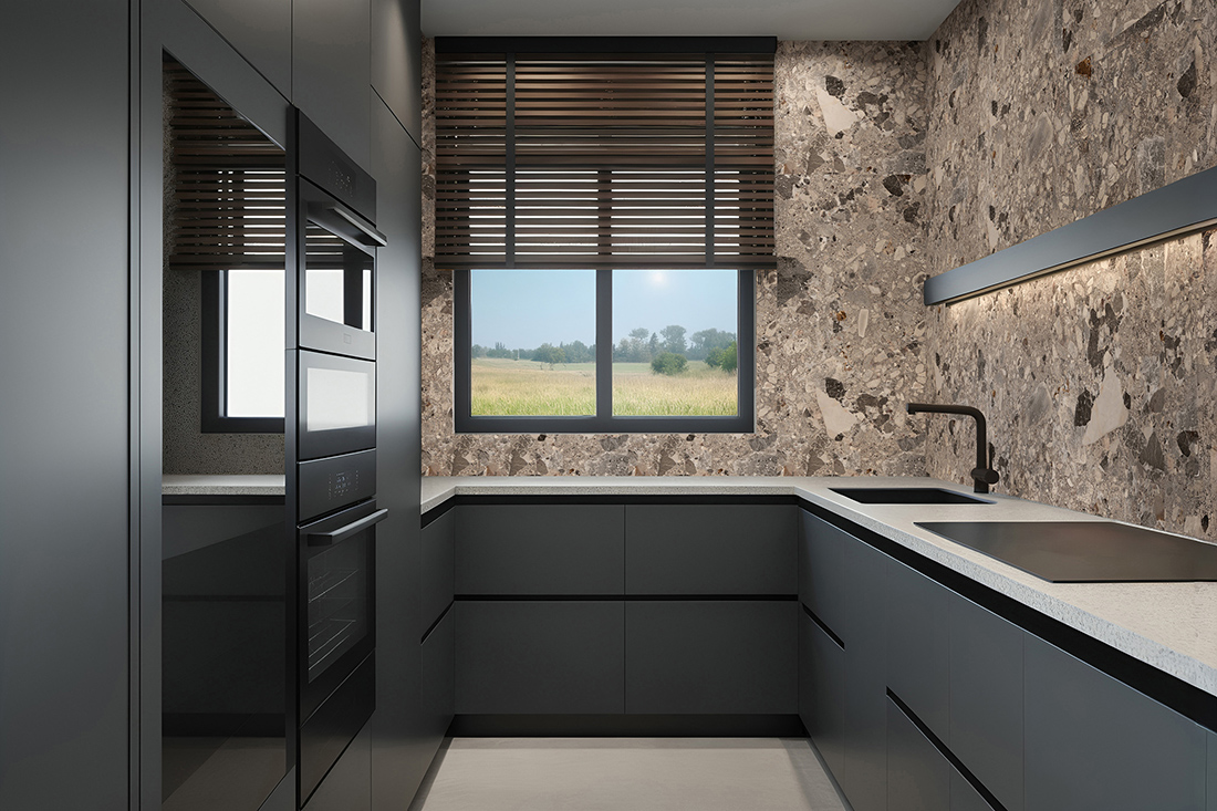 Kuhinja, iako prostorno odvojena, dizajnerski je usklađena s ostatkom interijera, uz nešto izraženiji suvremeni karakter koji naglašava njezinu funkcionalnu ulogu. Minimalističke fronte, tamniji tonovi i kamena obloga daju joj čist i elegantan izgled, dok promišljen raspored osigurava praktičnost i jasnoću korištenja.